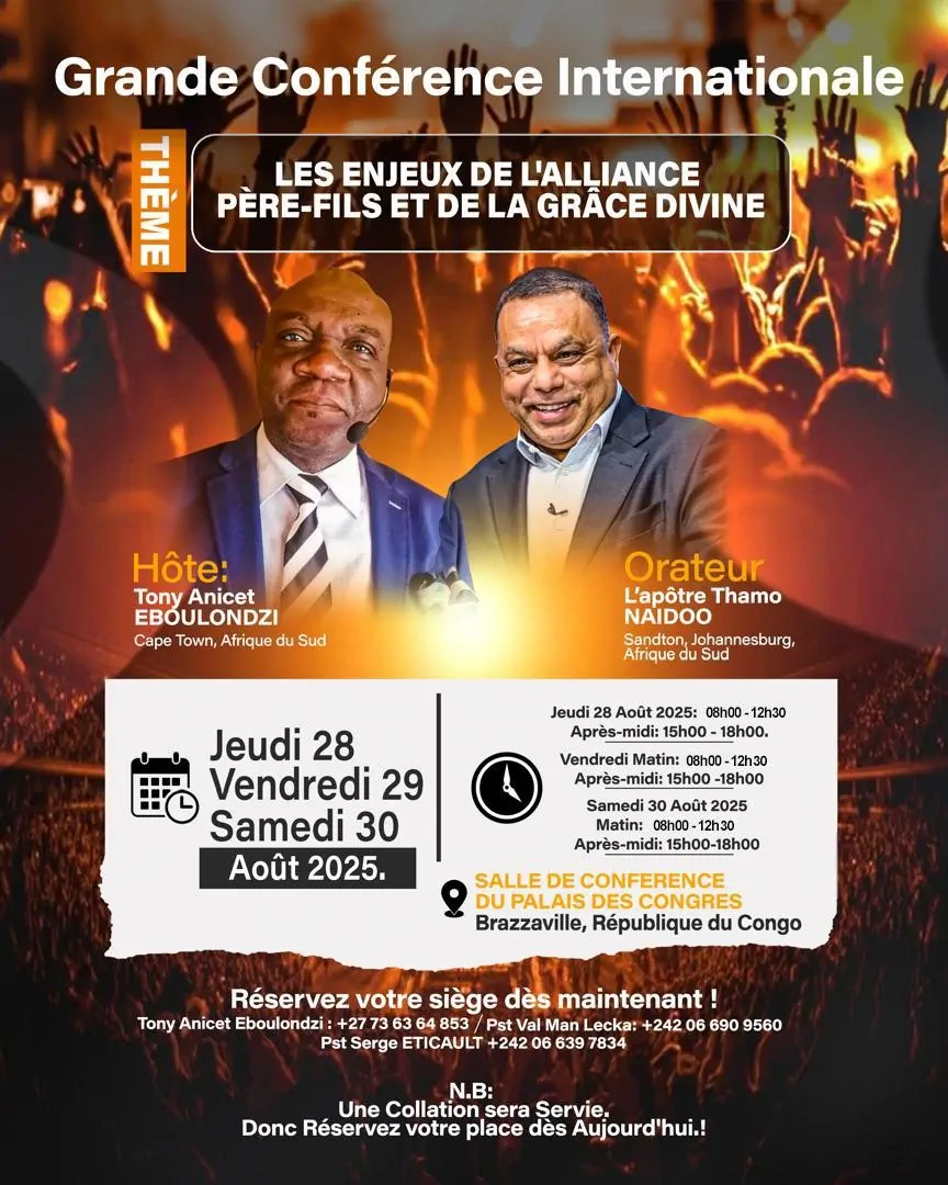 Vous etes cordialement invites a prendre part a une grande conference internationale qui se tiendra lieu au PALAIS DES CONGRES DE BRAZZAVILLE, LES 28, 29,30 Aout 2025.
